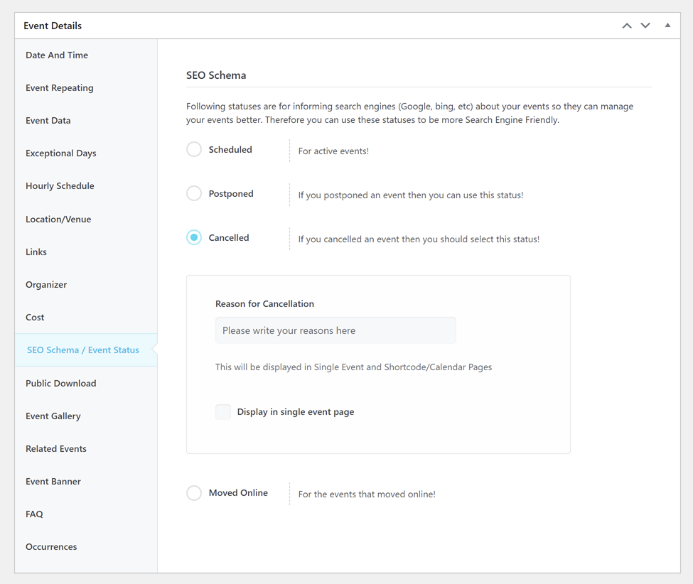Canceled: If the event has been canceled, you should select this status. You can fill in the “Reason for Cancellation” field, and it will be displayed on the events and shortcodes. To enable this feature for a specific event, you need to select the “Display in single event page” option.
