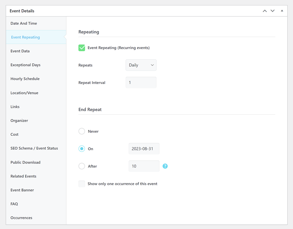 Lastly, you have the option to Show only one occurrence of this event. This means that only one instance of the event will appear on the archive pages and your shortcodes. The closest upcoming occurrence will always be displayed.