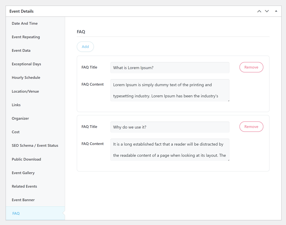 To display frequently asked questions on the event page, simply type them in. There is no limit to the amount of FAQs that can be added.