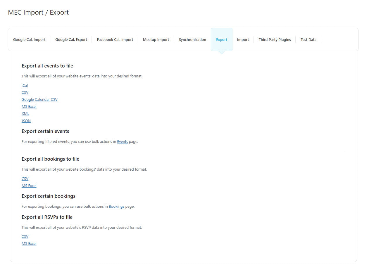 To export your RSVPs, you have the option to choose from two file formats. CSV and MS-Excel. Just click on the desired format to proceed. To use the RSVP feature in MEC, you must install the RSVP Events addon. Once installed, you can easily access this section.