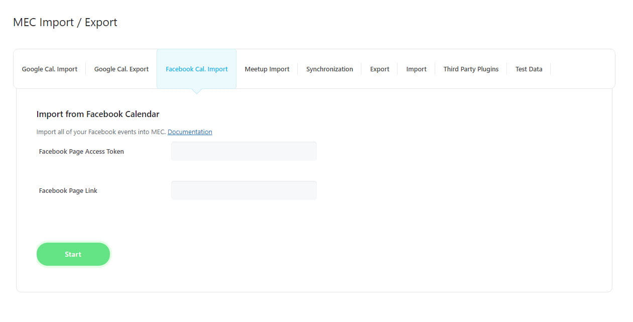 To import events from Facebook Cal, you need to set your Facebook Page Access Token and Facebook Page Link. Once you have done this, simply click on the Import button. For additional information on this process, click here.