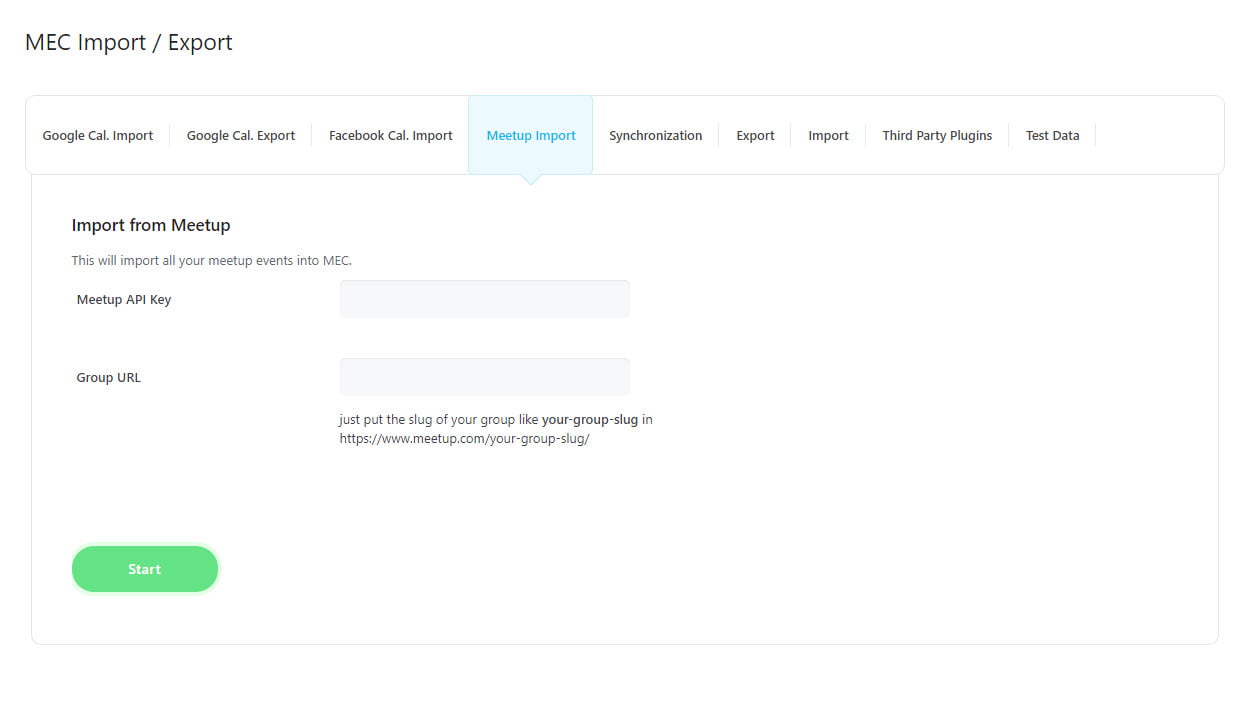 To import your Meetup events to MEC, you need to obtain and configure the Group Slug and Meetup API Keys. The Meetup website has the necessary information and instructions on how to access it.