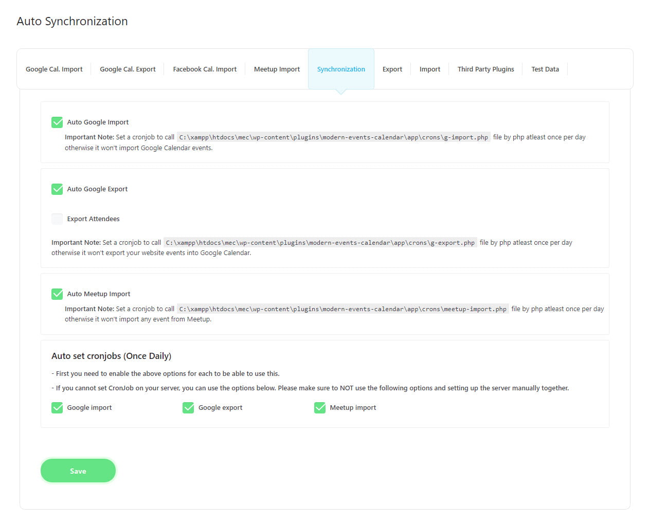 Note: In order to use the Auto set cronjobs (Once Daily) section and MEC cron jobs, your website host must support cron job functionality.