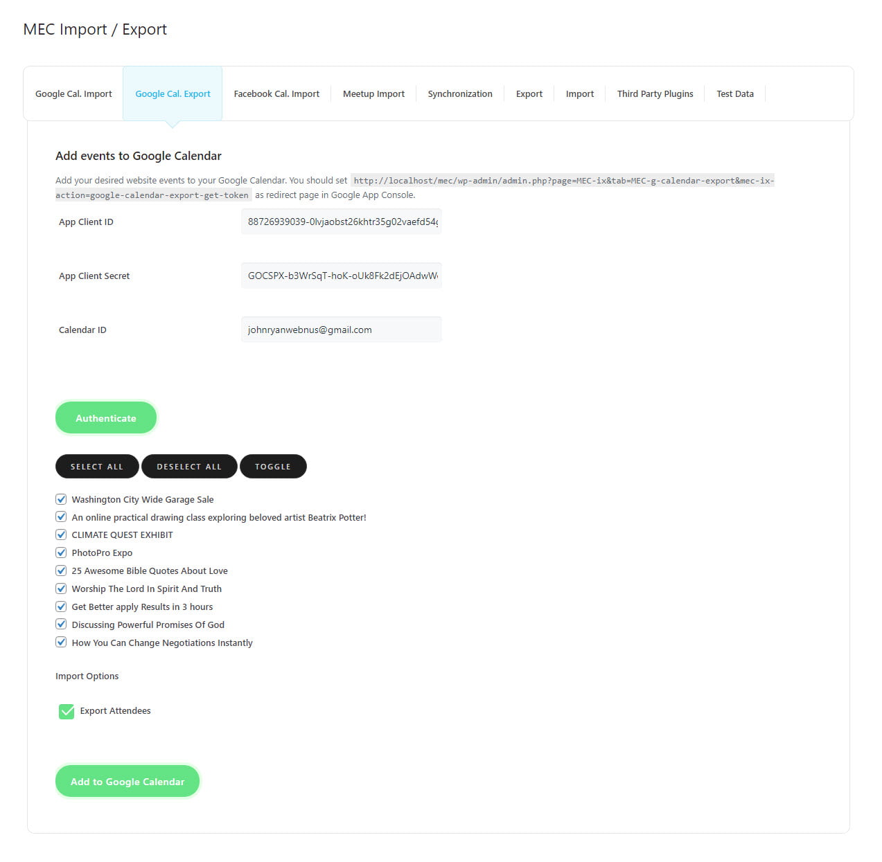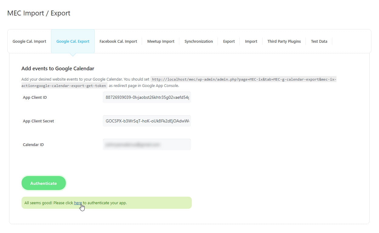 In order to export MEC events to Google Calendar, you will need to have a Client ID and Client Secret. You can find out how to obtain these by following this article. Once you have the required information, fill in the necessary fields and click the Authenticate button.