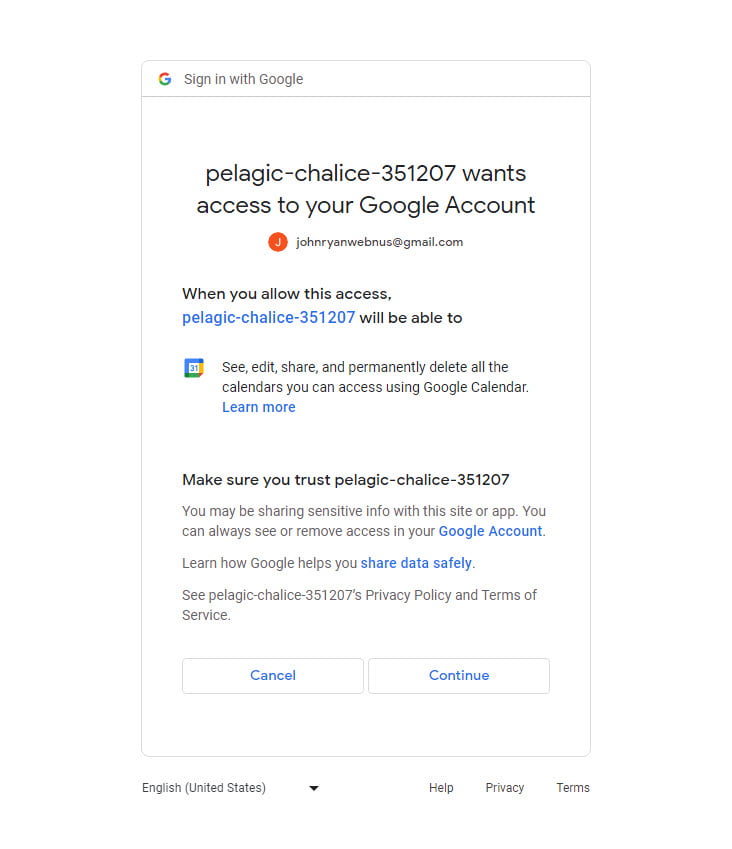 Next, you will be asked to log in to your Google account that is linked to your Google Calendar.