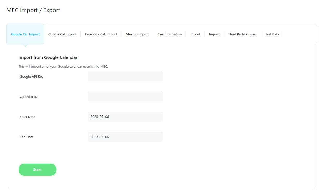 If you want to transfer events from Google Calendar to MEC, you’ll need to use the Google Calendar API. This article will guide you on how to get it. Once you have the API, simply enter it into the designated field labeled “Google API Key”.