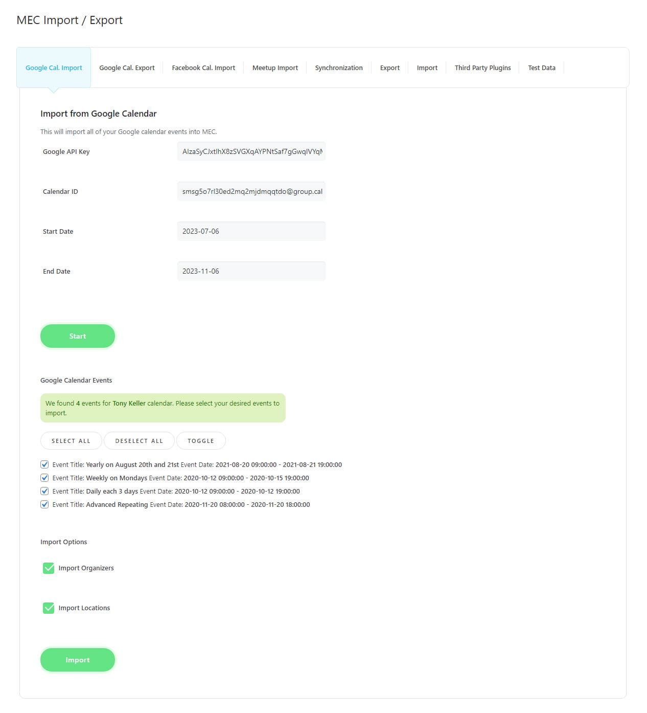 Once you click on the Start button, your calendar events will appear in a list. Simply choose the group of events you wish to import and click the Import button to add them to your MEC event list.