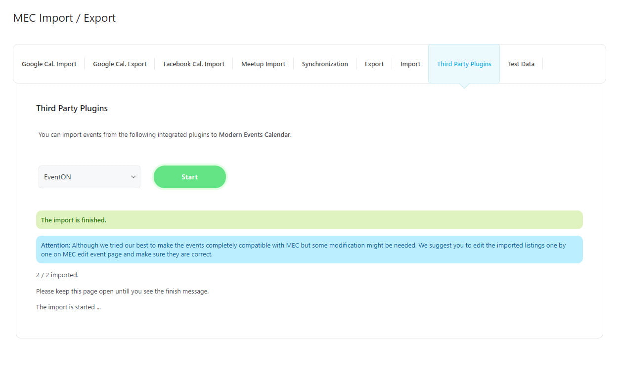 Note: The duration of the import process is determined by both the quantity of events and the settings of your WordPress server.
