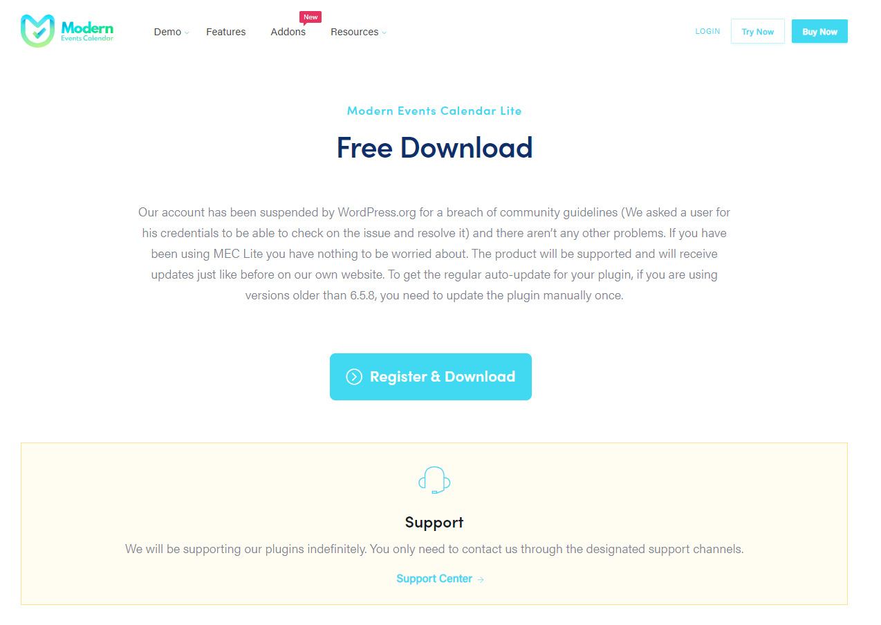 In order to install MEC Lite, you need to visit MEC Lite official page at Webnus and hit the “Register & Download” button (the blue one in the middle of the page).