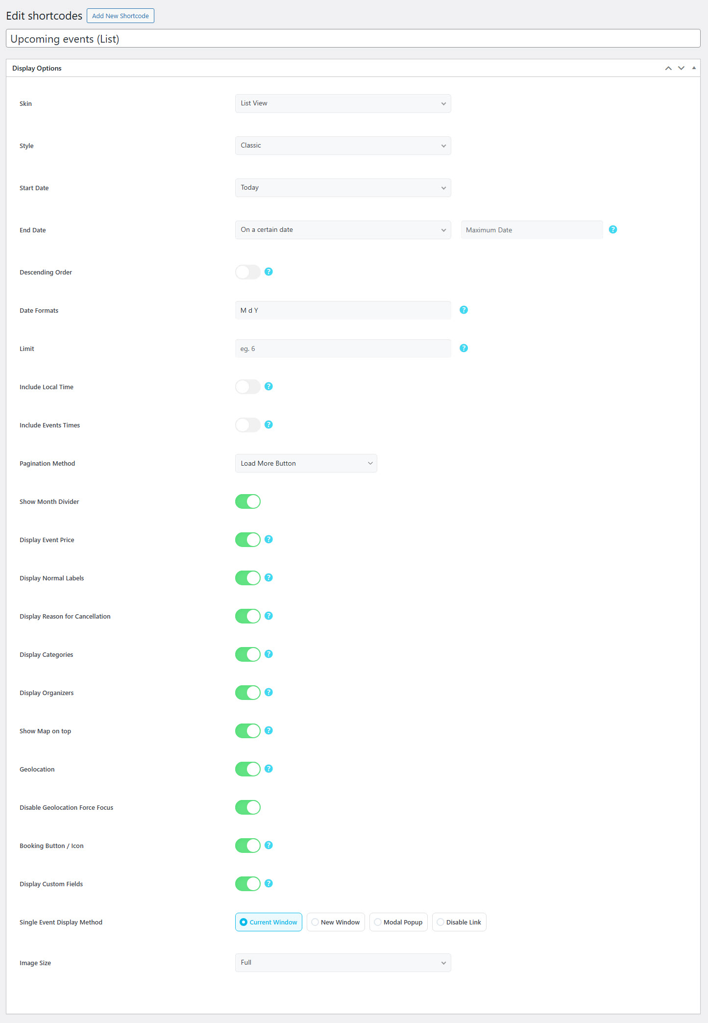 This option lets you control the size of event images displayed as thumbnails within the event listing shortcode. You can choose from a set of predefined sizes, including Default, Thumbnail, Medium, Medium Large, Large, and Full. By selecting the appropriate size, you can adjust the appearance of event images to better fit your layout, design preferences, or performance needs. This ensures that the event thumbnails are displayed consistently and in harmony with the overall style of your website.