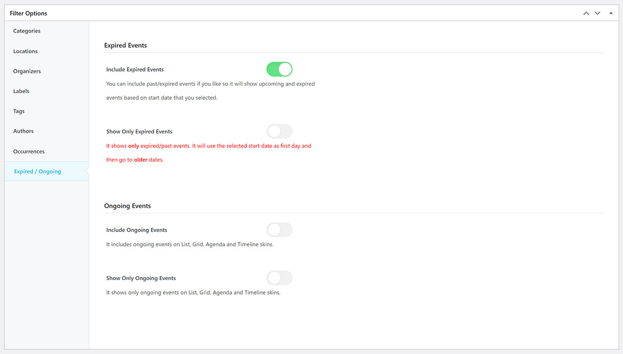 - Include Ongoing Events: It includes ongoing events on List, Grid, Agenda, and Timeline skins.