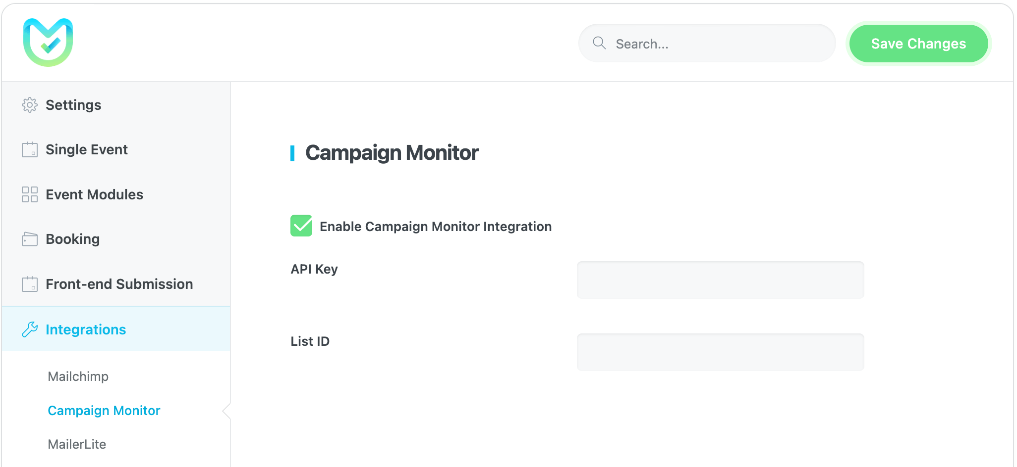 Grow your newsletter list automatically by syncing your Modern Events Calendar submissions with Campaign Monitor. To activate this link, you simply need to enter the API Key and List ID from your Campaign Monitor account. Campaign Monitor Documentation