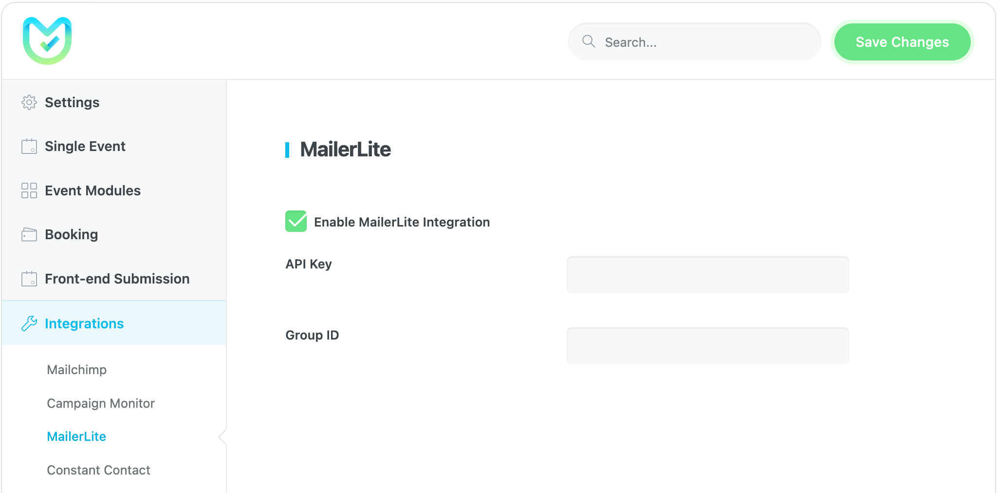 Connect Modern Events Calendar to your MailerLite account to grow your subscriber list. To activate this connection, you just need to enter the API Key and Group ID from your MailerLite account. MailerLite Documentation