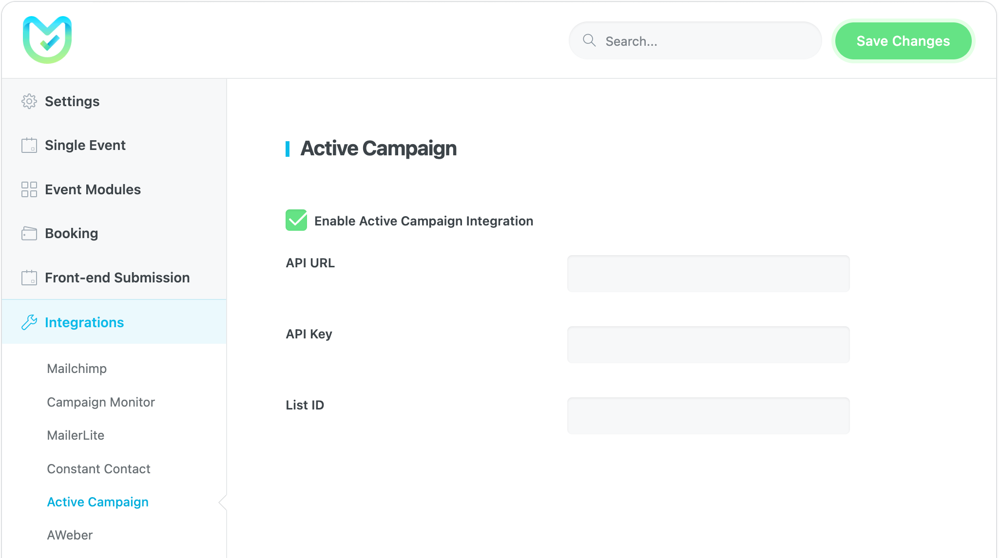 After activating the Enable Active Campaign Integration option in MEC Settings > Integrations > Active Campaign, you’ll encounter the following three new fields: API URL, API Key, and List ID.