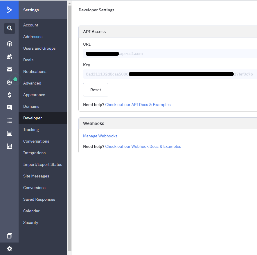 Navigate to your Active Campaign settings in the Developer section to find your API Key. Afterward, find the necessary information highlighted in the image below and enter them in the MEC Settings.