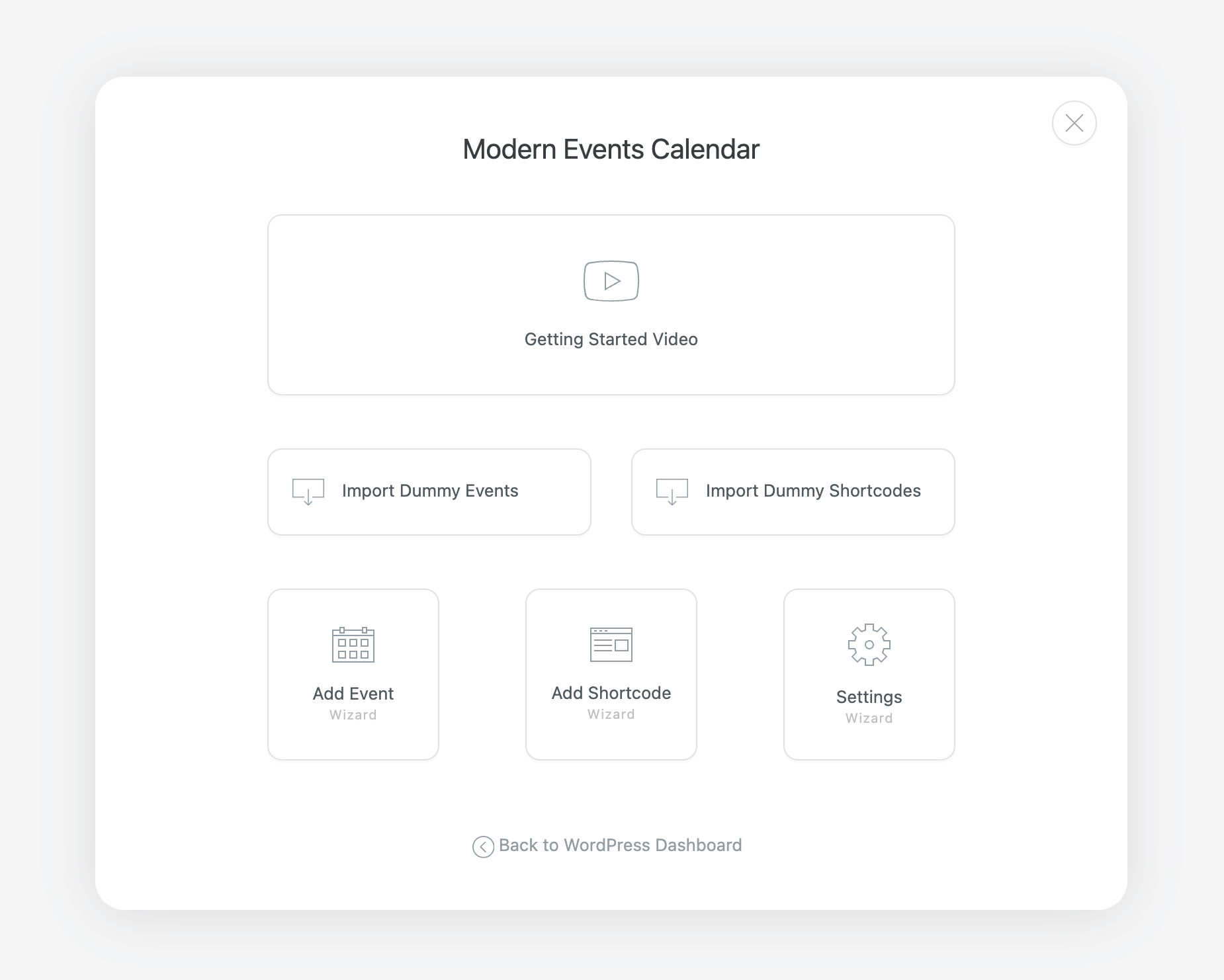 MEC Wizard offers you access to Add Event, Add Shortcode, Settings, Import Dummy Events, Import Dummy Shortcodes, and Getting Started Videos of MEC. It’s noteworthy that these wizards would not show all of the available fields on those pages. They are just a shortcut to create and manage events and settings faster.