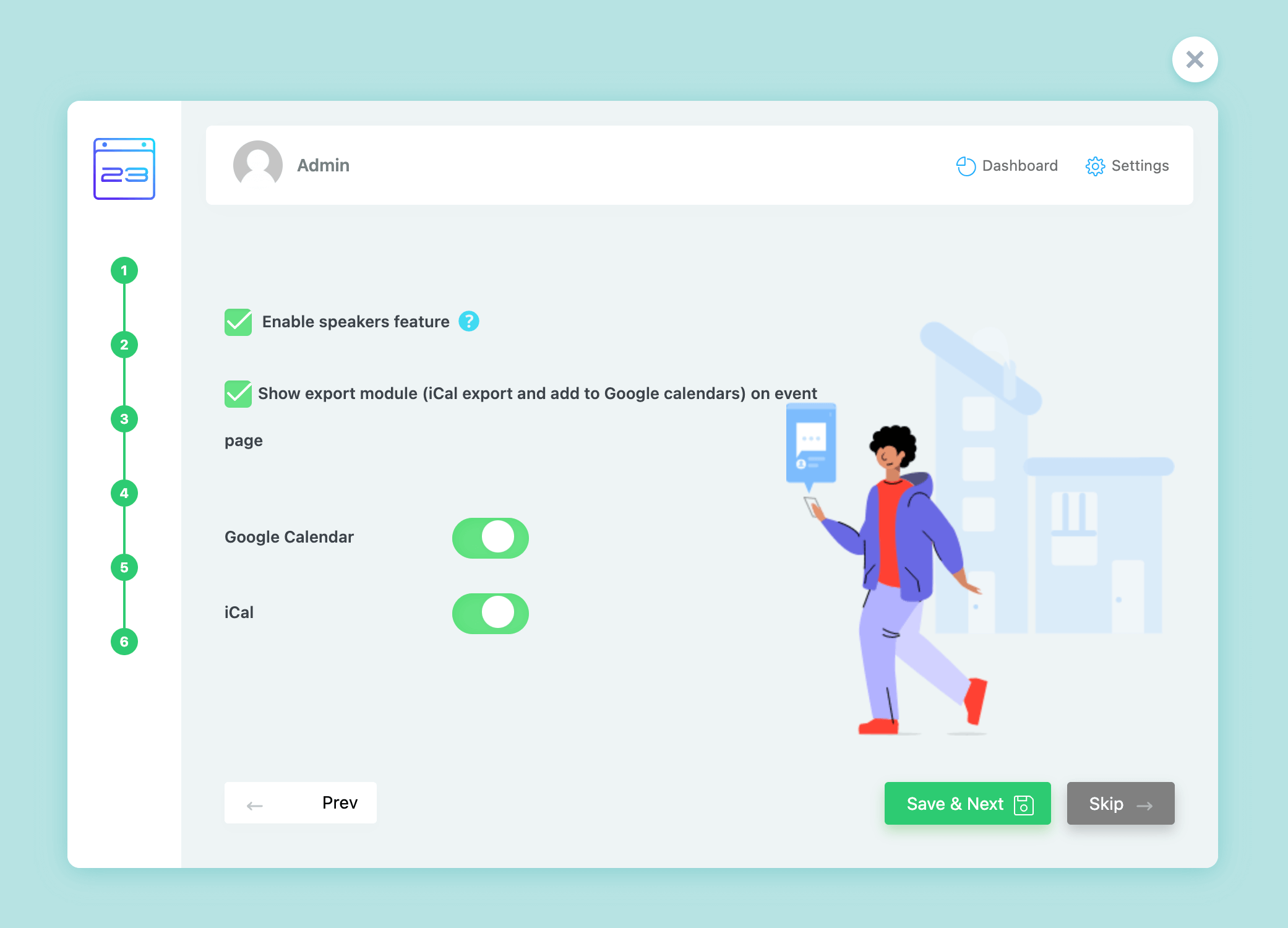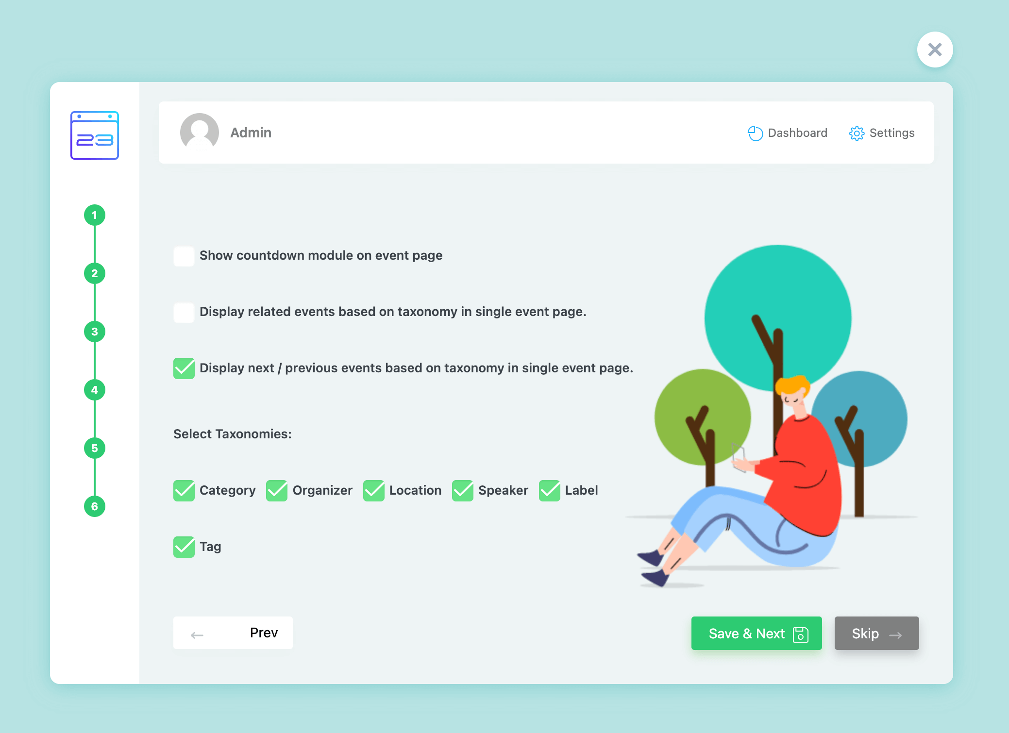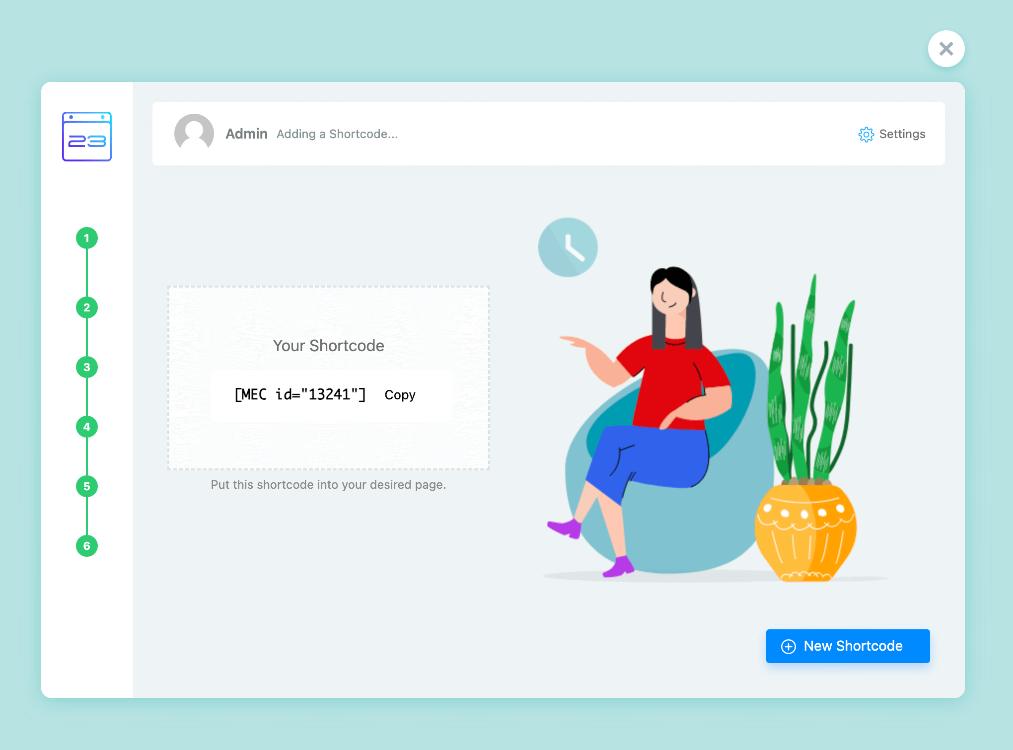 After installing and activating MEC, you will be redirected to the MEC Wizard page. Here, you can click on any of the Import Dummy buttons to import events or shortcodes that are prebuilt in MEC.