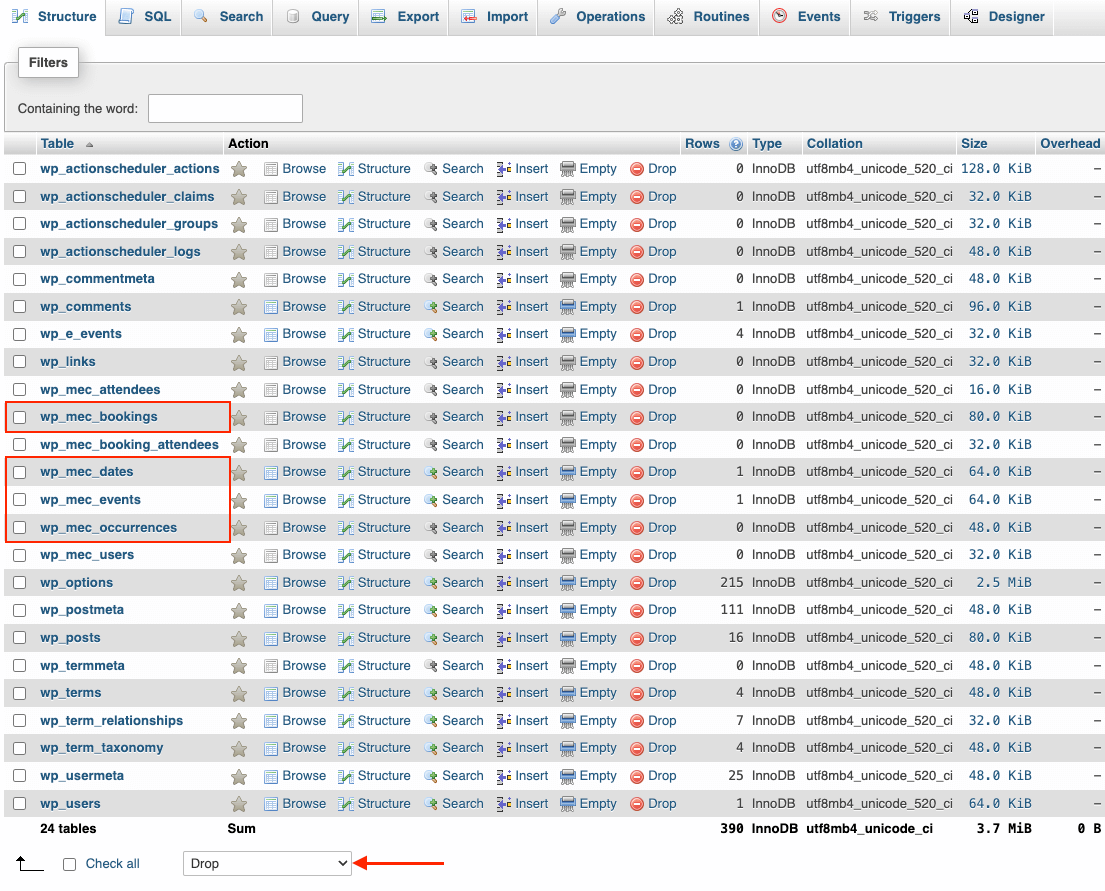 Firstly, please find the “#__mec_*** ” and delete them (Drop).