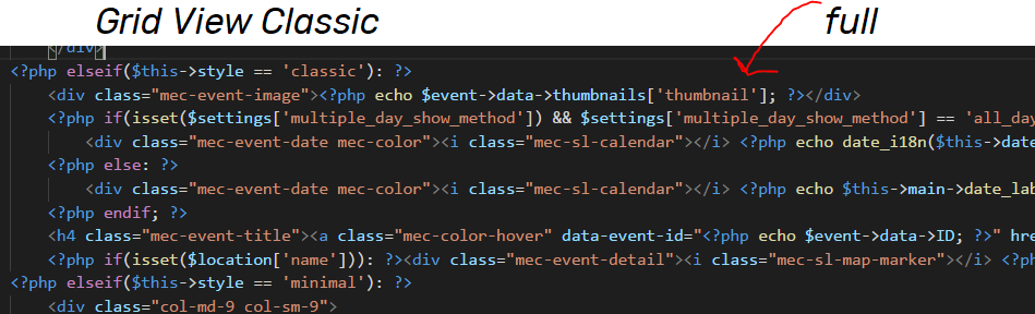 To use cropped images in MEC, you need to follow specific sizes. Once you have cropped the images, you can also use full-sized images. To access the “render.php” file, go to the directory and match it with the shortcode skin.