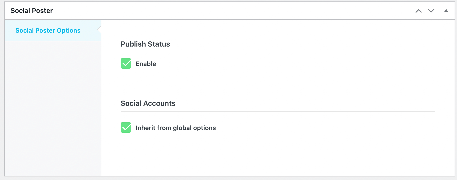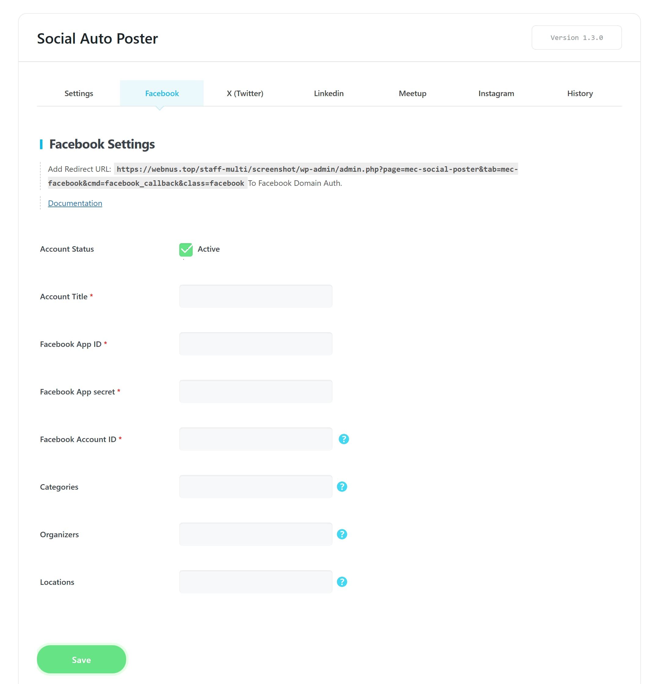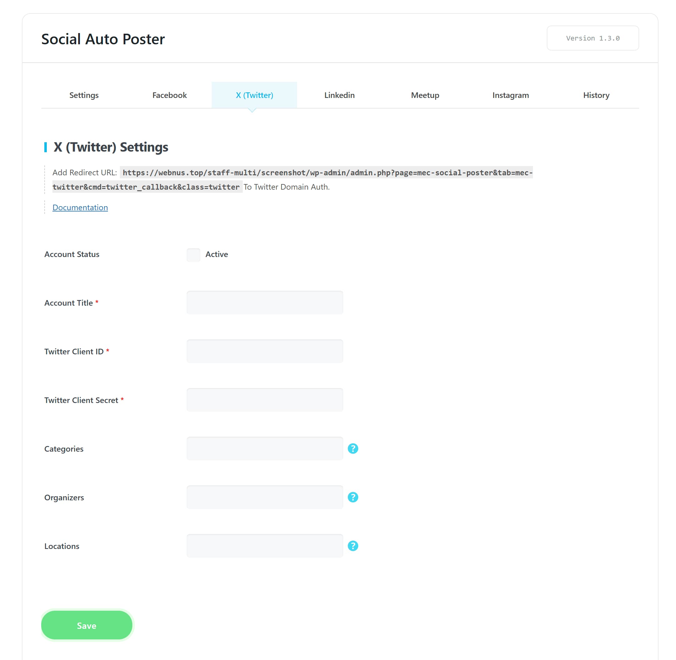 After installation and activation, a new option called Social Poster will be added to MEC’s menu. Once you click on it, you will see this page: