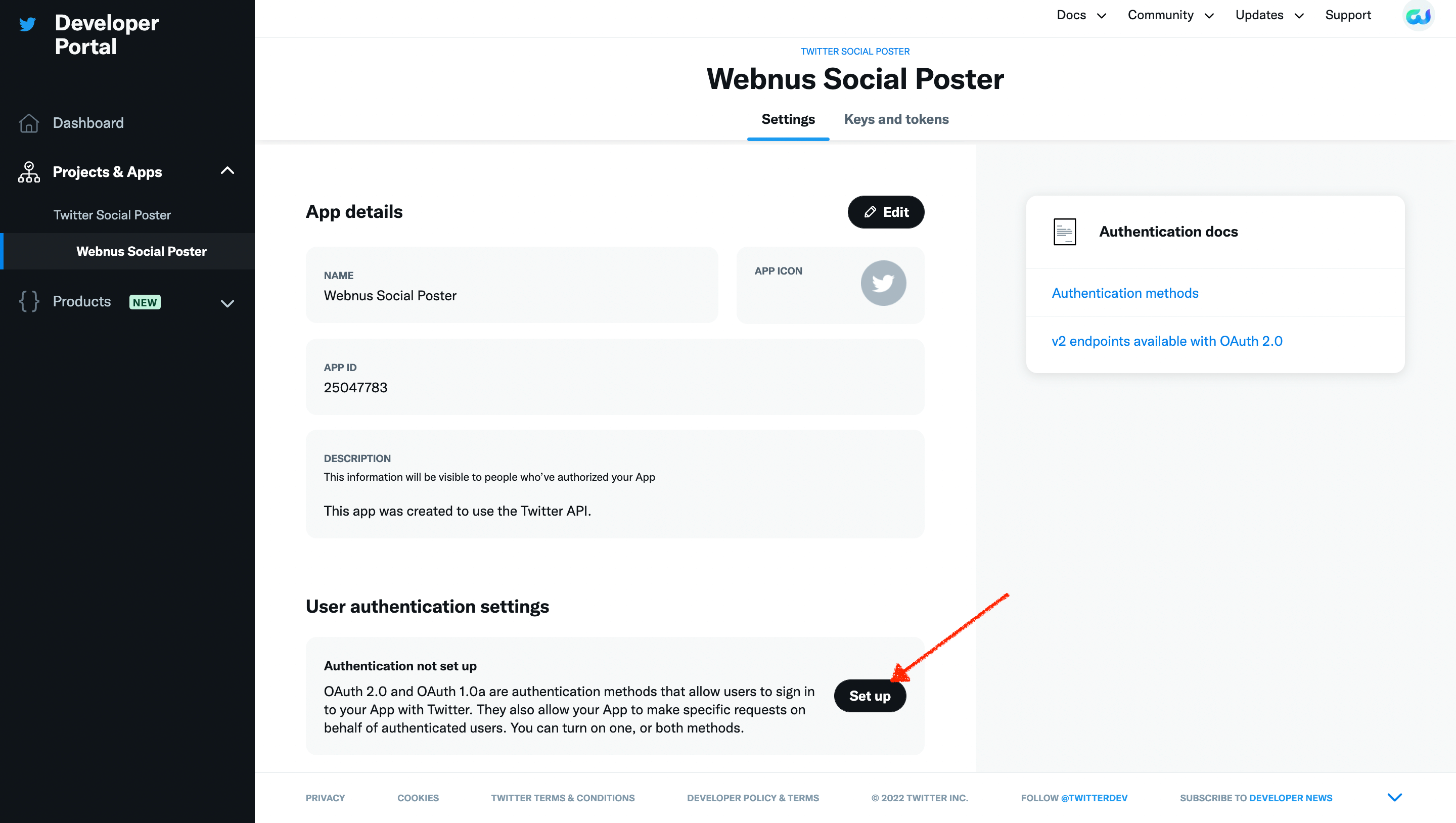 From the menu to the left, click on the app you’ve just created, and from User Authentication Settings, click on Setup.