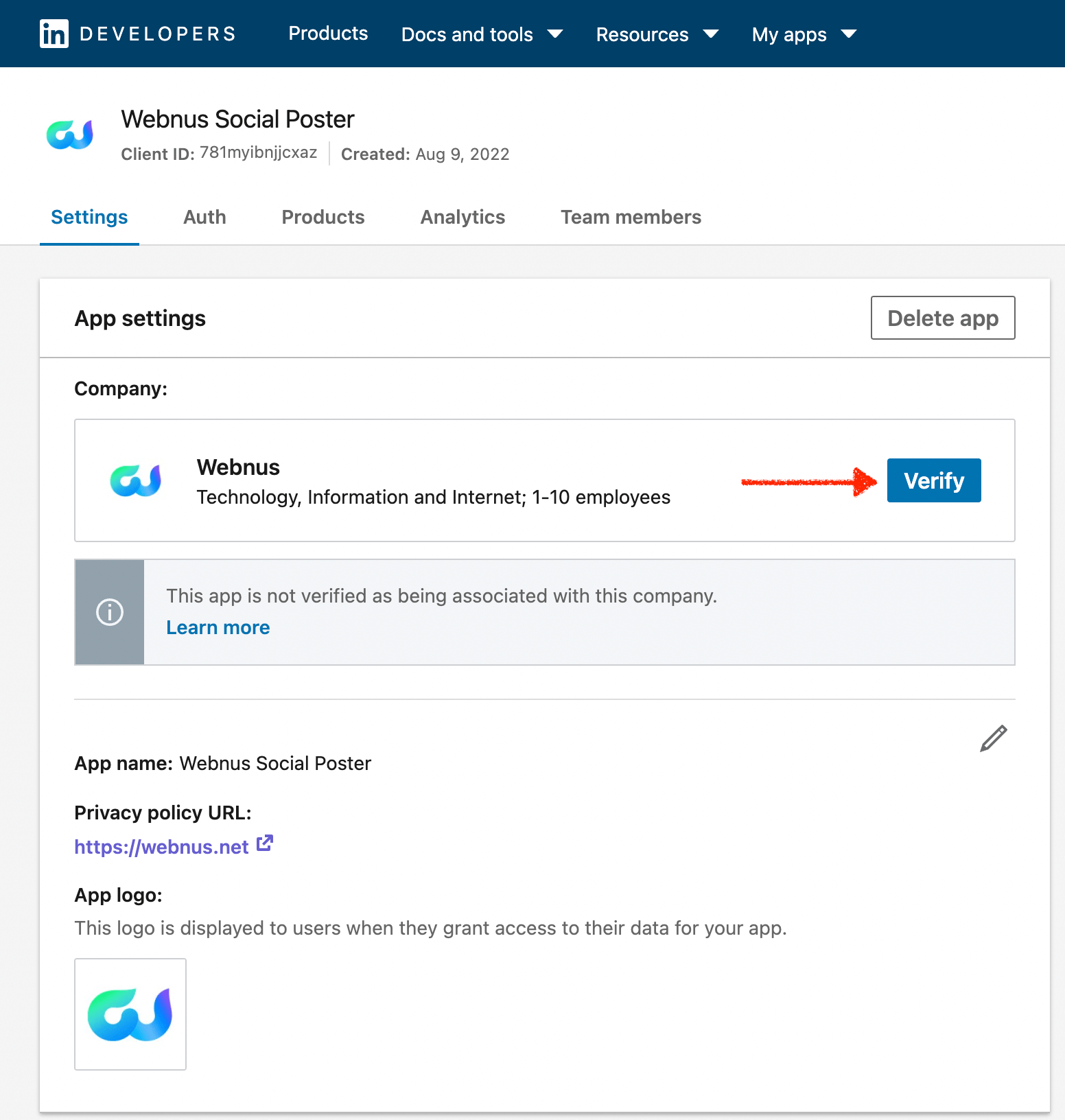 Then, you have to go to the Settings tab and verify the LinkedIn page.
