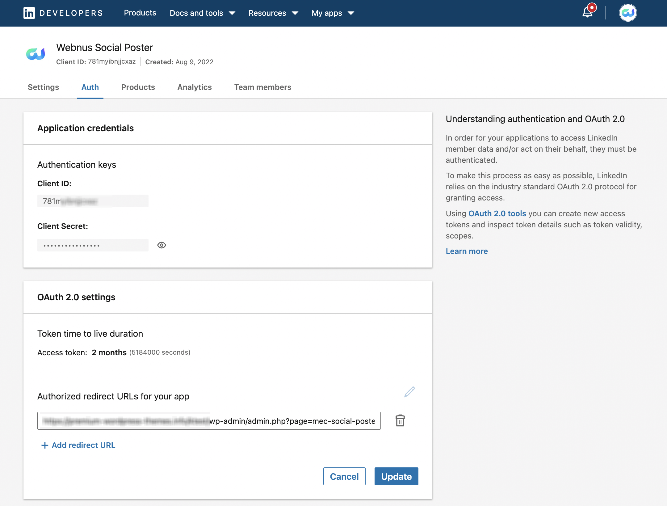 Then go to the Auth tab and copy the redirect address from your website from M.E.Calendar > Social Poster > Settings > LinkedIn and paste it into Authorized redirect URLs for your app.