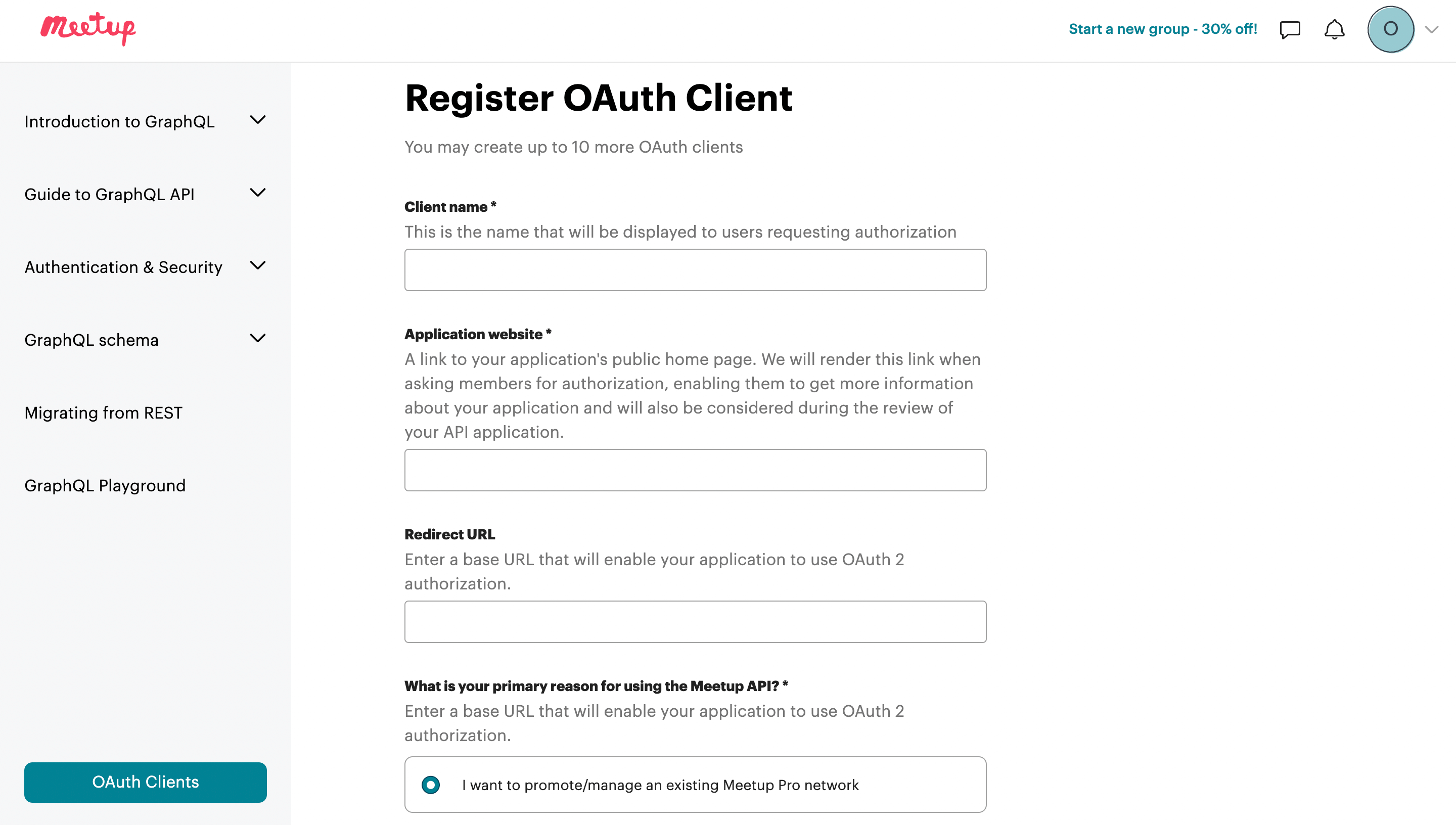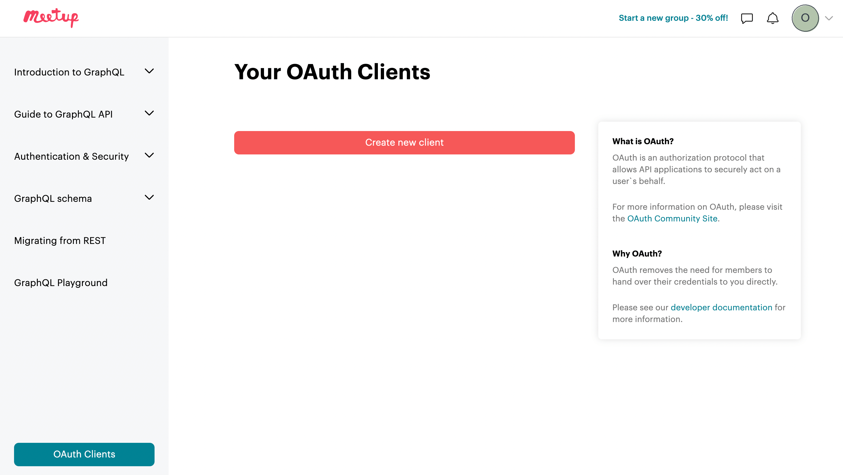 To enable the Social Auto Poster Addon for Meetup, you need a Meetup account. After creating an account, to create a new app, go to this link and click on OAuth Clients.