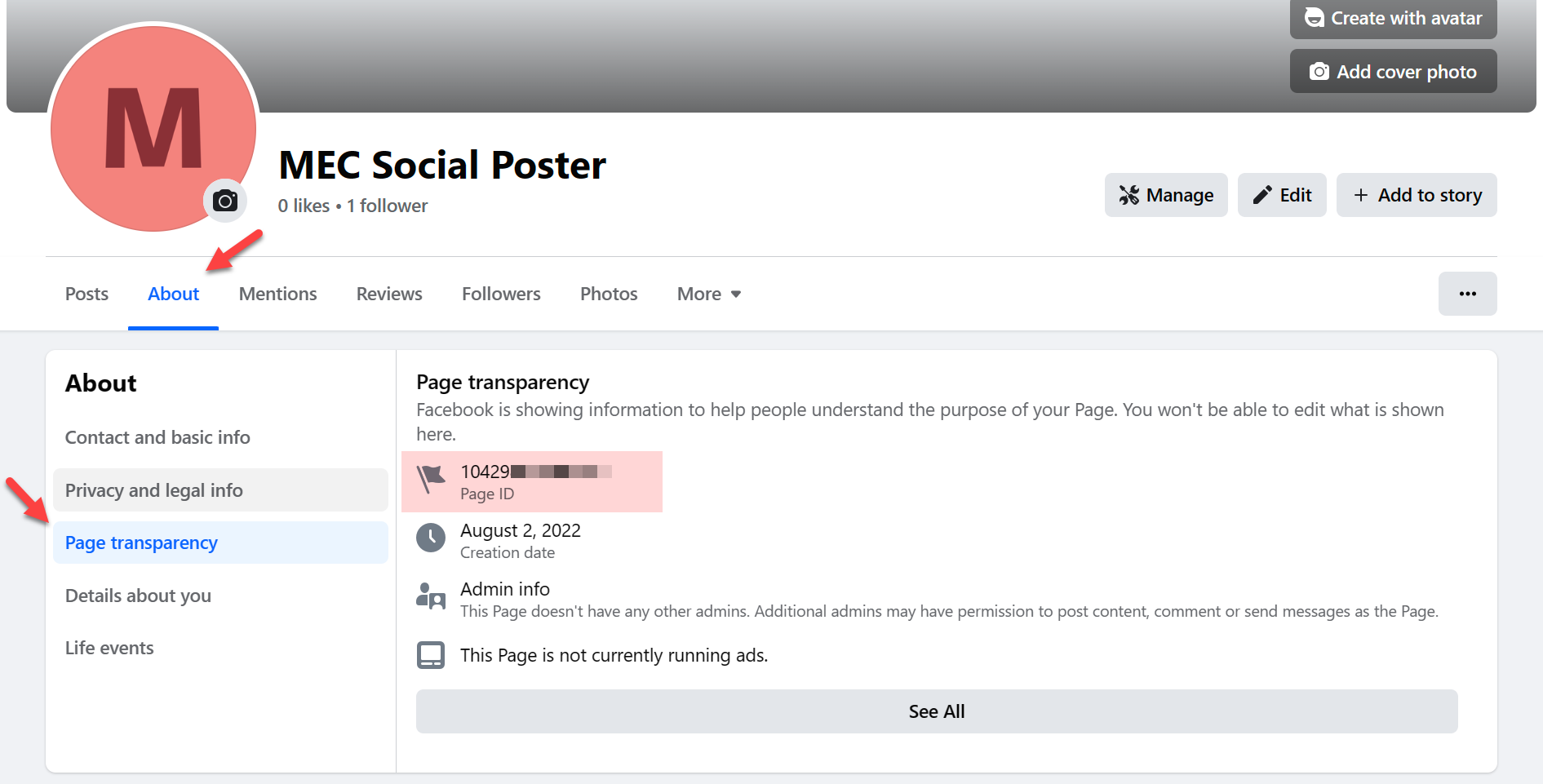 Finally, go to the About tab on the Facebook page you created. Choose Page Transparency there from the menu. Your page ID will be visible in the section on the right.