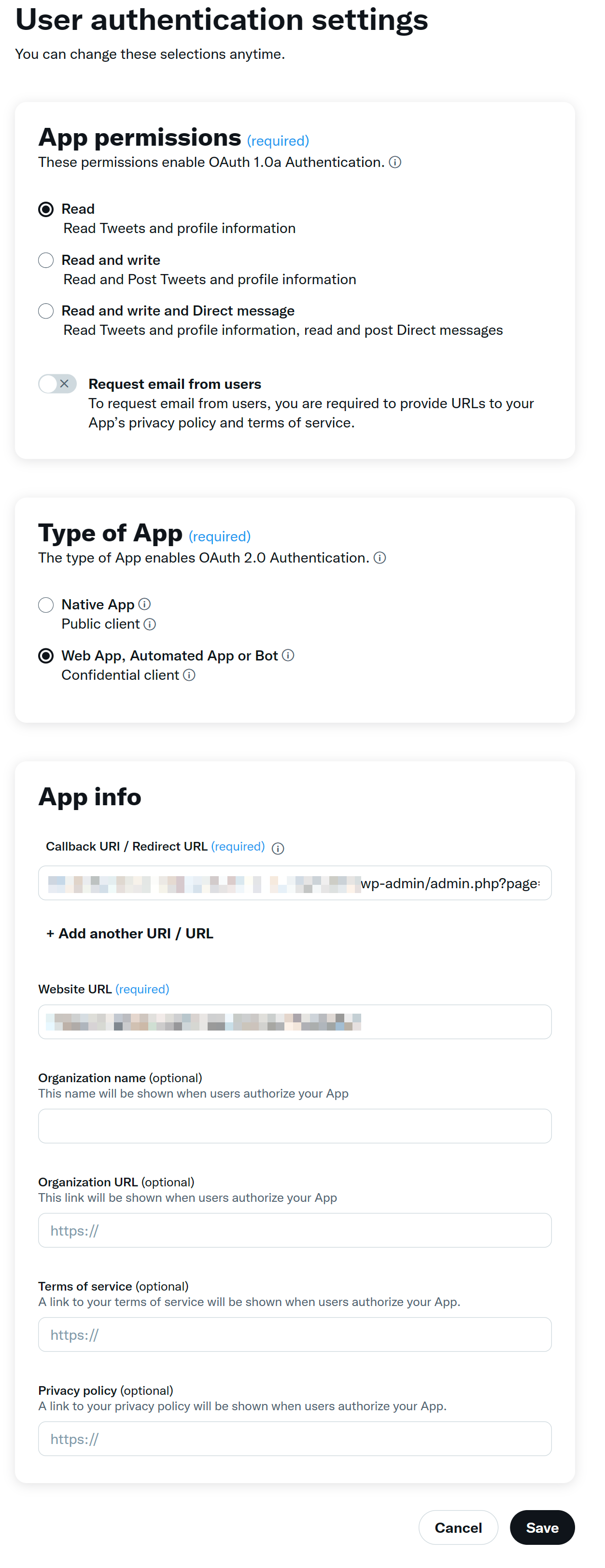 To enter your website redirection info, go to M.E. Calendar\> Social Poster > Twitter.