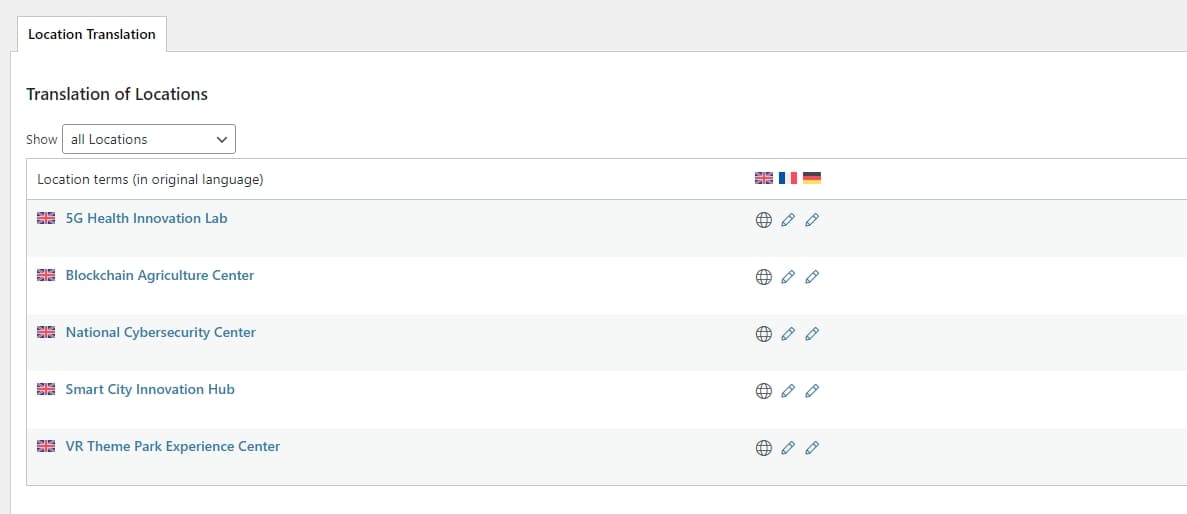 Here, for each language added in WPML languages, you will see a duplicate of the original event. For example, if English is set as the original and French and German are added for localization, you will see one entry for French and one for German. You will also be able to view the status of each translation. Since the translation has not yet started, the status will display as “Needs translation.”