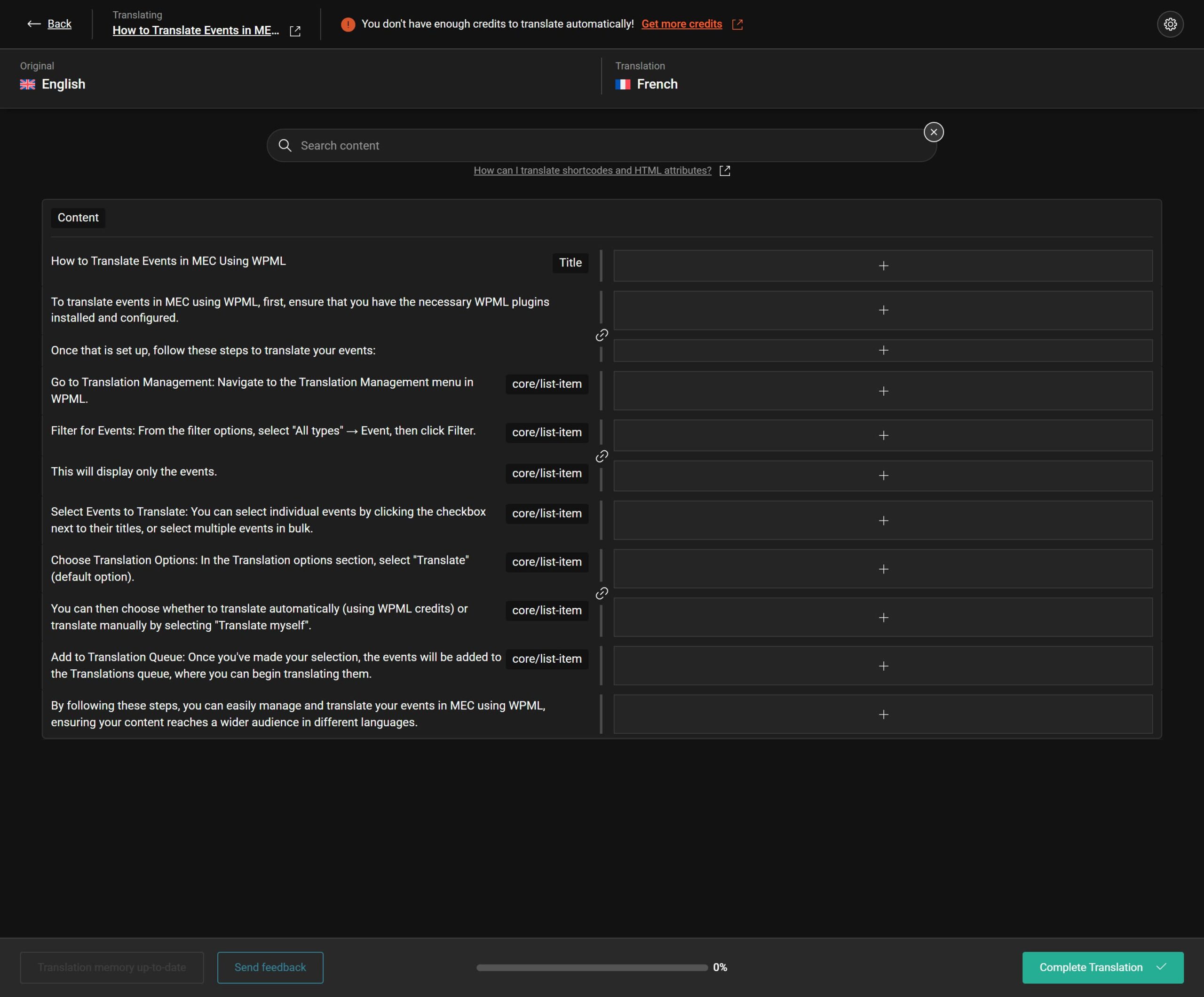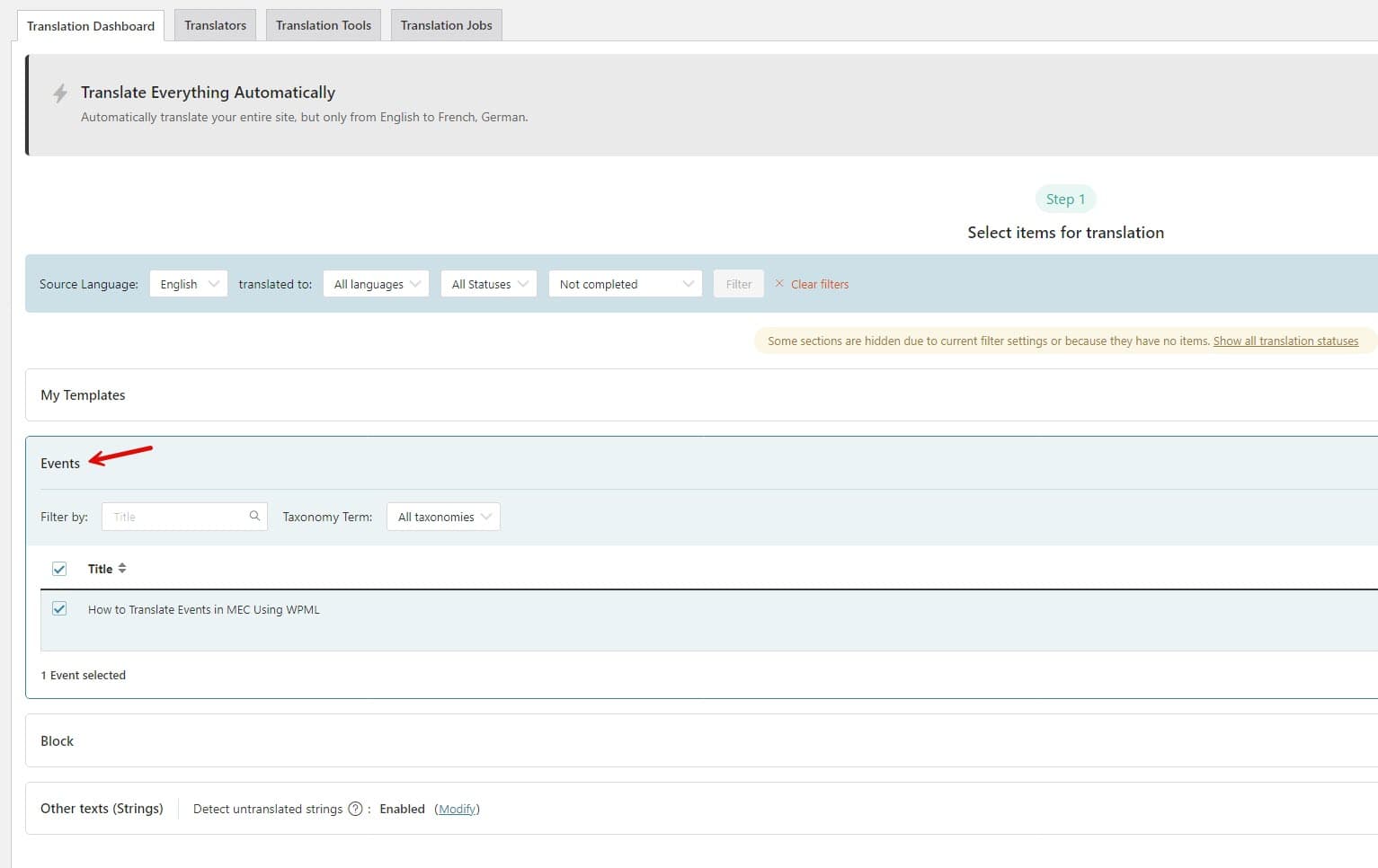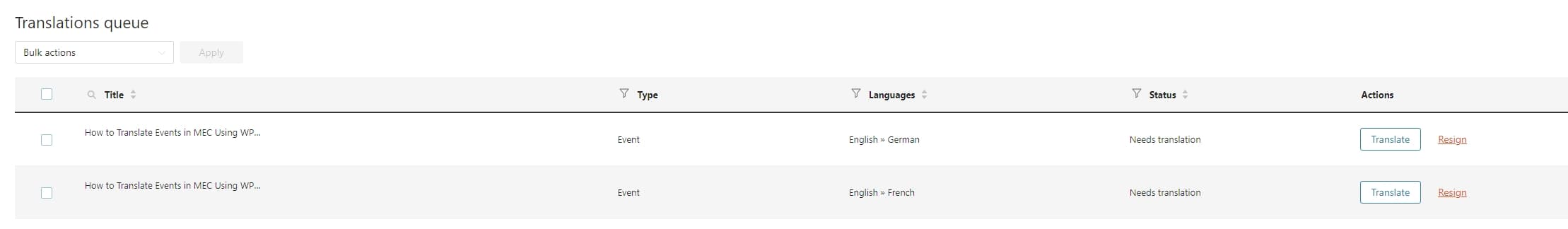Now that you have all the events listed, you can select them and send them to the translation queue, either individually or in bulk. To do so, click the checkbox next to each event title.