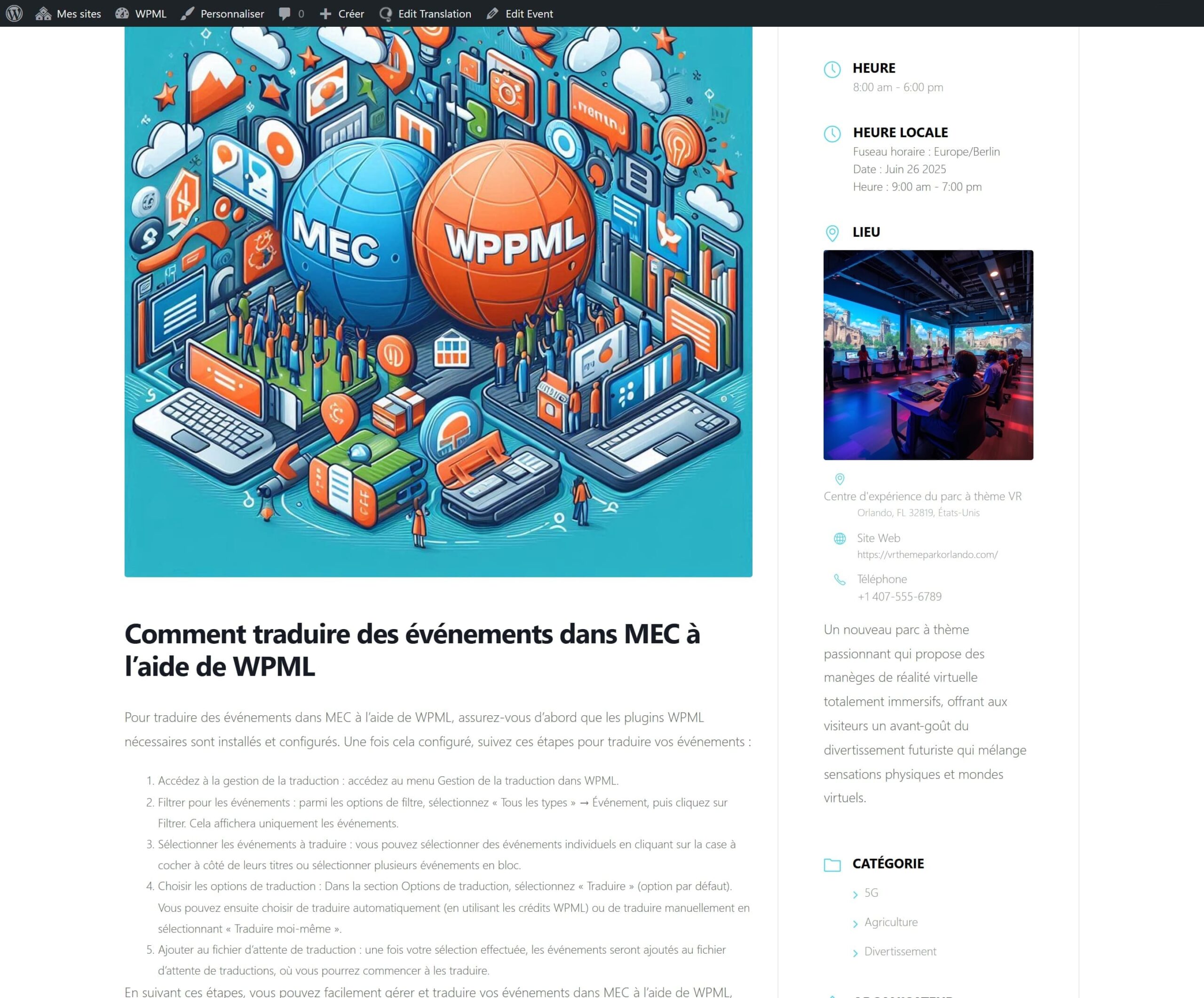 Now it’s time to check the results of our hard work. You can go back to your event and switch the language from your main language to the translation, which in my case is French. You’ll see that WPML has worked its magic, smoothly and seamlessly translating the event into the desired language (French in our case). If you take a closer look at the event, you’ll also notice that all other modules and taxonomies have been translated into their respective languages as well.