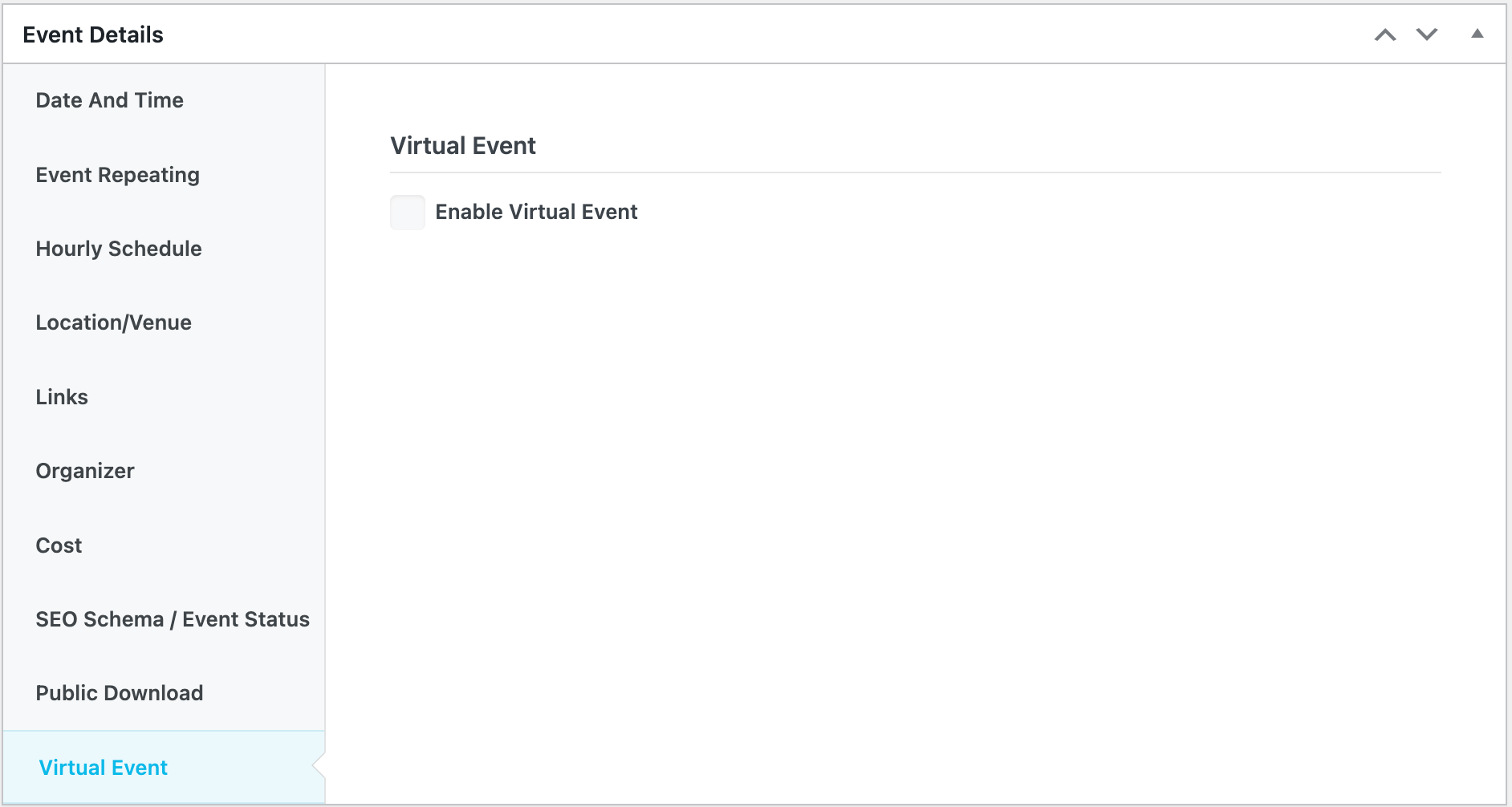 To initiate the process, go to a single event in the backend and proceed to the Event Details section. Find the Virtual Event menu and activate the feature for the selected event.