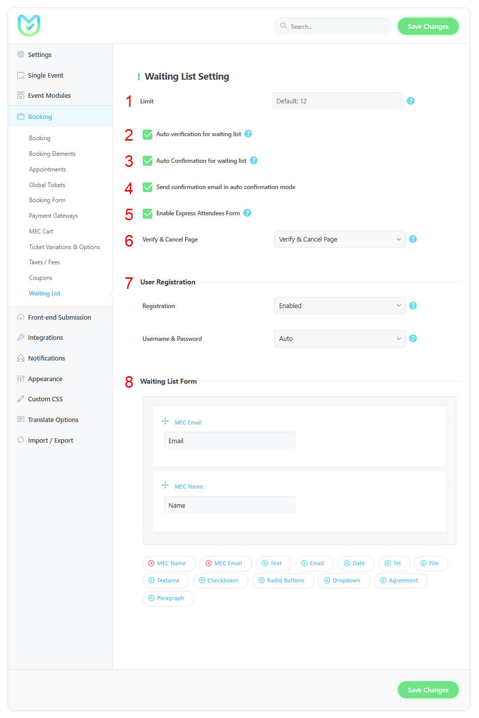8\. Waiting List Form: Create a dedicated form for waiting users, similar to the form builder in MEC.