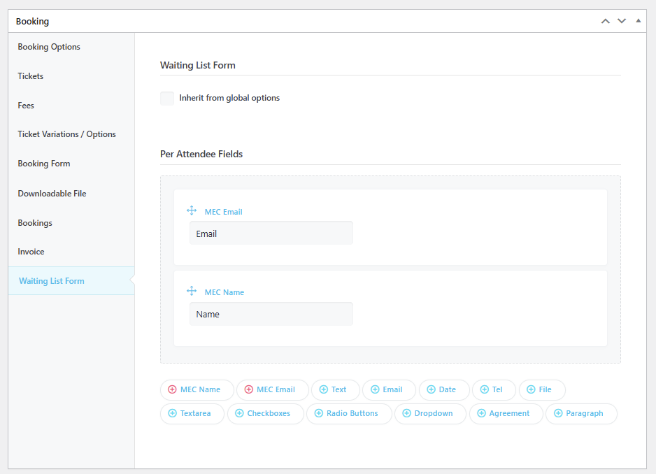 Once you activate the Waiting List Addon, a new menu will be added to MEC Settings > Booking called Waiting List.