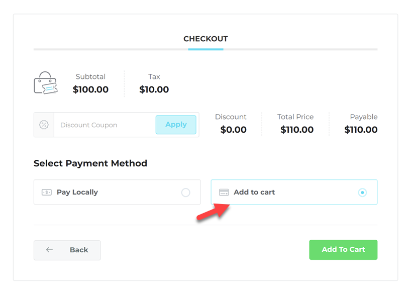 Then, during the final stage of the booking process, you can find an option in the Select Payment Method section called “Add to Cart.” This allows you to add the tickets you’ve selected to your WooCommerce shopping cart.