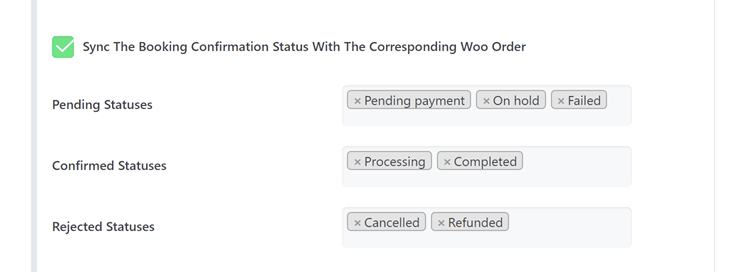 - When the Booking confirmation status is marked as Confirmed, the Woo order will be on Completed status.