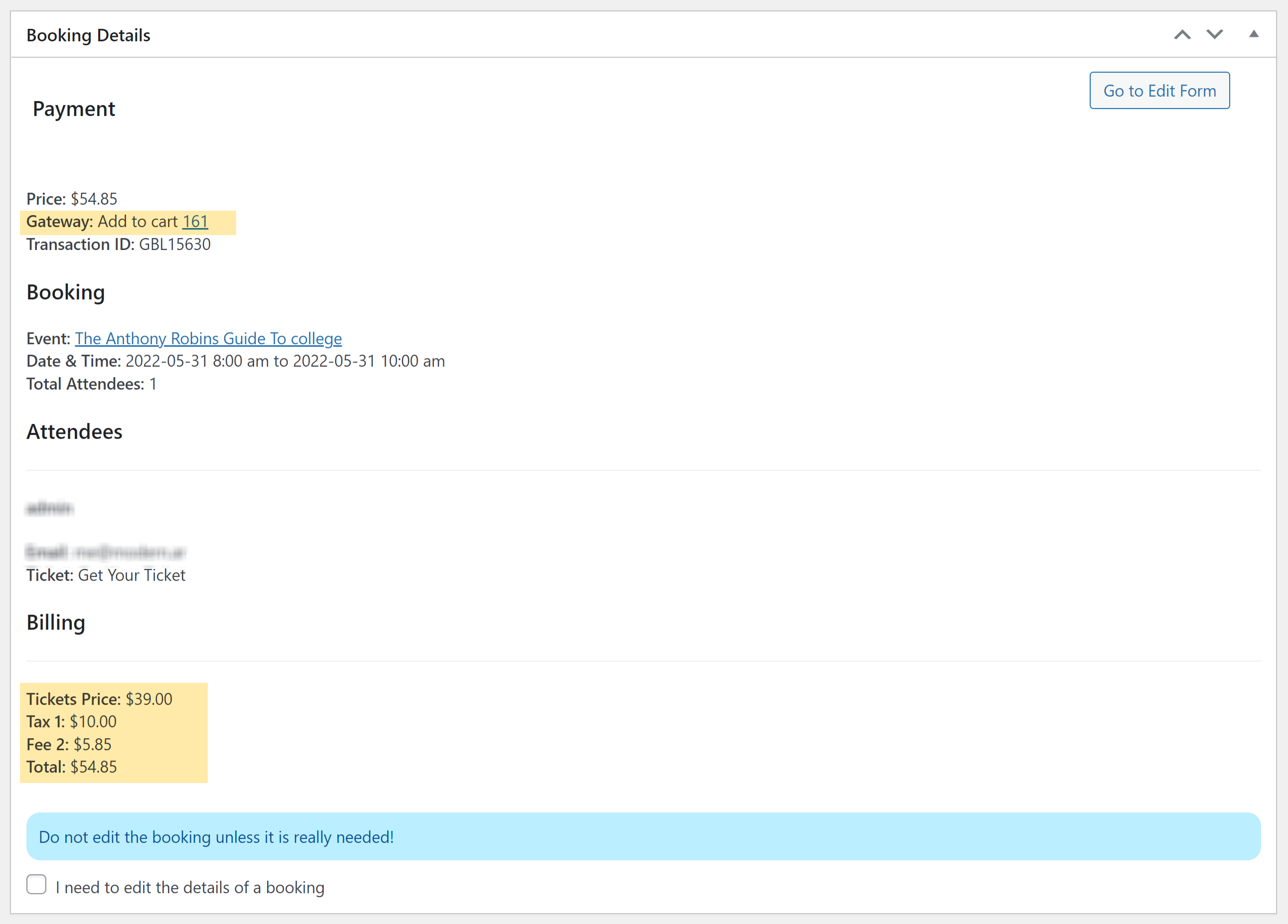 The image below shows a ticket with taxes and fees added directly from the MEC cart. The payment for the ticket was also completed through this process.