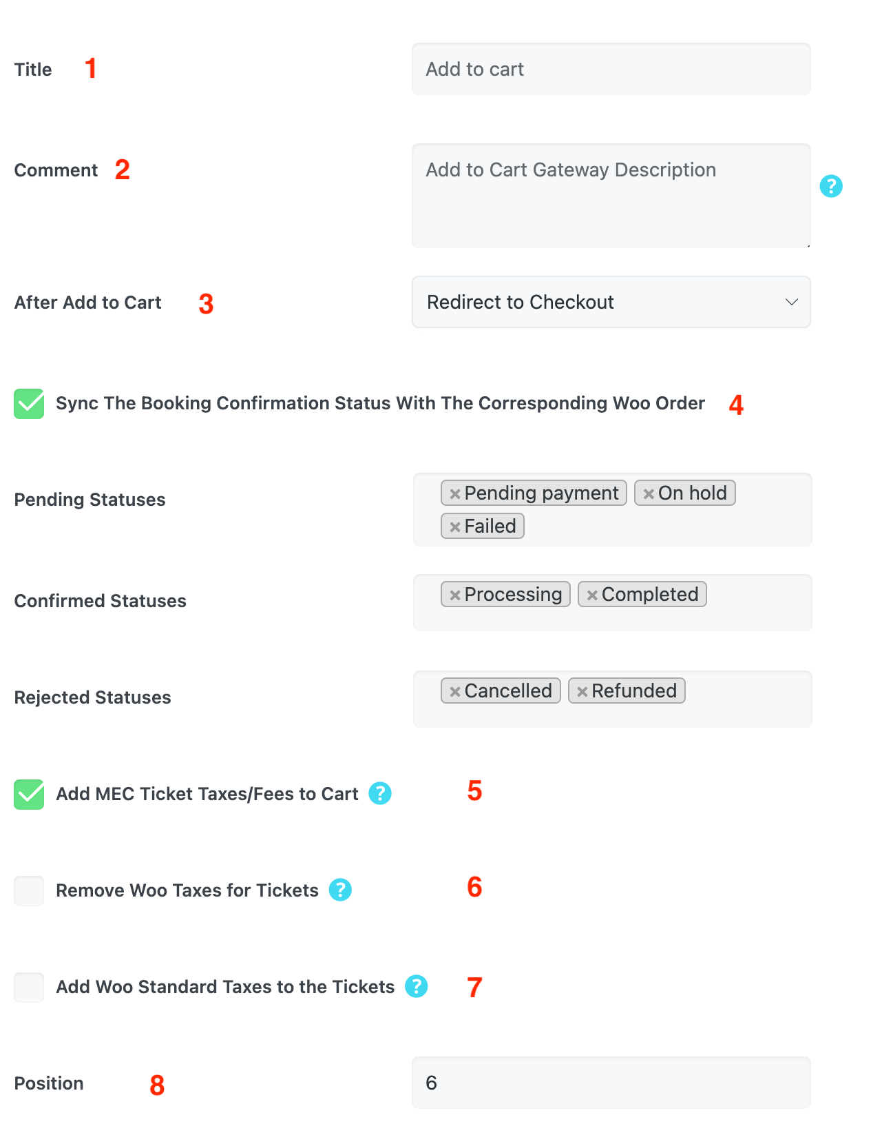 Navigate to the WooCommerce Integration Addon setting through MEC Settings > Booking > Payment Gateways and enable the “Sync WooCommerce Order Status with MEC Booking Status” option.